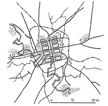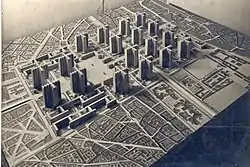 На этом плане посетители салона обнаружили город, разделенный на три отдельные части: центральную, деловую и жилую с миллионом жителей; районы заложенные на дальнейшие развитие; периферийный пояс города-сада на два миллиона жителей. Две автострады с большой переходами над ними пересекаются под прямым углом в самом центре города, где 24 небоскреба вокруг аэропорта составляют деловой район[2].