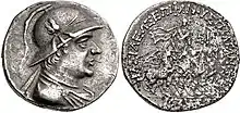 ![]() Монета Платона с изображением колесницы. По мнению некоторых историков, изображение колесницы на монете связано с причастностью Платона к убийству своего отца Евкратида I, тело которого было после смерти изувечено с помощью колесницы. | |