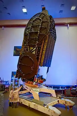 - Модуль служебных систем (МСС) основан на центральном цилиндре, проходящем через всю конструкцию КА и прикрепляющемся к ракете-носителю во время запуска. Цилиндр несёт на себе все остальные элементы модуля: солнечные и аккумуляторные батареи, апогейный двигатель с цистернами для горючего, двигатели коррекции и удержания и другие компоненты[7].