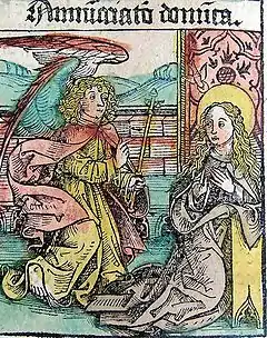 ![]() Вильгельм Плейденвурф Благовещение из Хроники Нюрнберга, 1493 | |