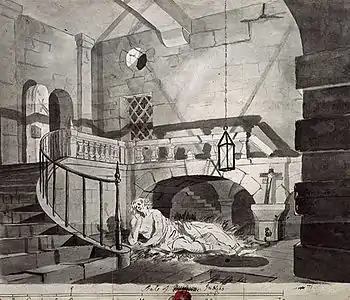 Эскиз был назван «Пленный король» и изображает французского дворянина Ги де Лузиньяна в плену Саладина. Лузиньян сражался с Саладином 4 июля 1187 года и был взят в плен после поражения его армий. Говорят, что реликвии от истинного креста были потеряны во время этой битвы[1]. Лузиньян, который пришёл из французского Пуатье, стал королём Иерусалима посредством женитьбы на Сибилле, дочери Амори I. В конце концов Лузиньян был освобожден Саладином и продолжил править Кипром. Эскиз Джозефа Райта содержит аннотацию его друга Питера Переза Бурдетта[2]. Райт брал у Бердетта уроки по перспективе и советовался с ним по поводу выстраивания своих картин.