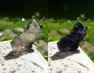 - Танзанит (плеохроизм кристаллов танзанита не слишком контрастный, в зависимости от освещения они меняют цвет в диапазоне от синего до сиренево-фиолетового, иногда коричневатого или бурого из-за добавления зелёной окраски)
