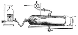 Плетизмограф (см. рис. 1) состоит из стеклянного цилиндра G, суживающегося на одном конце и переходящего здесь в трубку; в цилиндре два боковых отверстия а и Р. Конечная трубка цилиндра при помощи каучуковой трубки соединяется с резервуаром воды F, отверстие Р при помощи тоже гуттаперчевой трубки соединяется с записывающим полиграфом Марея Т, а отверстие а служит для выливания воды из плетизмографа. В свободное отверстие цилиндра, снабжённое резиновым рукавом, обхватывающим плечо, вставляется рука испытуемого человека. По установке руки в цилиндре в него вливается из резервуара S вода при закрытом отверстии а и открытом P до полного вытеснения воздуха из цилиндра. По достижении этого отверстие P соединяется с полиграфом, а кран резервуара F запирается. Рука оказывается заключённой в воде в герметически замкнутом пространстве цилиндра, сообщающегося только с записывающим полиграфом Марея Т. Этот последний своим пером должен следовать за колебаниями объёма руки, и вот почему: как только объем руки увеличится вследствие прилива в неё крови, то есть расширения сосудов, так она (то есть рука) станет вытеснять воду из цилиндра в одном единственно доступном направлении к полиграфу Т, вода будет давить на воздух в трубке и полиграфе и будет приподнимать гуттаперчевую стенку последнего вместе с упирающимся в центр её записывающим пером; последнее своим приподнятием будет указывать поэтому на увеличение объёма руки и, наоборот, при уменьшении объёма руки вода из трубки P будет просасываться в цилиндр, воздух в трубке и полиграфе Т будет разряжаться, и эластическая стенка последнего станет опускаться вместе с записывающим пером. Полученная таким образом плетизмографическая кривая линия показывает троякого рода волны (см. рис. 2); самые мелкие — пульсовые, выражающие, что при каждом сокращении сердца объем органа — руки ли, ноги и т. д. — увеличивается вследствие прилива новой порции крови, вталкиваемой сердцем в органы тела; эти пульсовые волны сидят на более широких дыхательных волнах колебания объёма органов, зависящих от того, что при начале каждого вдоха кровь сильно присасывается из вен к сердцу, а при начале выдоха, — наоборот — кровь несколько задерживается в венах; поэтому при вдохе получается падение, а при выдохе, наоборот, повышение объёма органов; так как на каждое дыхательное движение приходится около 4 сердцебиений, то дыхательные колебания объёма органов реже пульсовых.[1]
