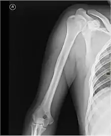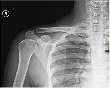При травмах плеча возможно повреждение нервов и сосудов, а также переломы плечевой кости, наиболее частой локализацией которых является шейка плечевой кости.[1]