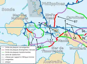 Плита отделена от Австралийской плиты и маленькой плиты Маоке дивергентной границей на юго-востоке. Конвергентная граница на севере отделяет плиту Птичья голова от Каролинской плиты, Плиты Филиппинского моря и Сундской плиты на северо-востоке. Трансформный разлом отделяет плиту Птичья голова от Плиты Молуккского моря на юго-западе. Другая конвергентная граница отделяет плиту Птичья голова от Плиты моря Банда на юго-западе[1].
