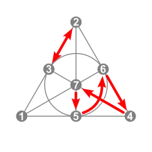 - Существует 21 флаг, состоящий из прямой и точки на ней. Каждый флаг соответствует неупорядоченной паре других точек, лежащих на той хе прямой. Для каждого флага существует 8 различных симметрий, сохраняющих его.