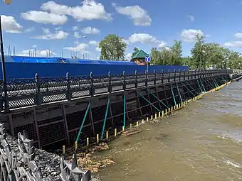 В 1950-е годы пешеходная и проезжая части, проходящие по гребню плотины, были разделены чугунными фигурными решётками, выполненными мастерами завода[4]. Рисунок ограды южного откоса плотины, состоящей из 217 секций, включает растительные орнаменты и элементы советской символики[3]. В 1963—66 годах в летний период собственными силами завода была произведена реконструкция водосливов. Деревянные лотки были заменены железобетонными, образовавшиеся вымоины засыпали щебнем. В 1983—84 годах было отсыпано новое тело плотины, вдвое больше прежнего[1][29].