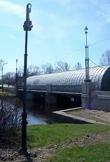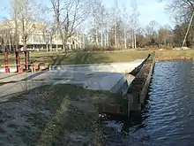 Выше этой плотины открылась глухая из металлического шпунта преграда с верхним порогом слива на отметке 7-7,4 м. Балтийской системы высот, оставленная после реставрации 1987 года.