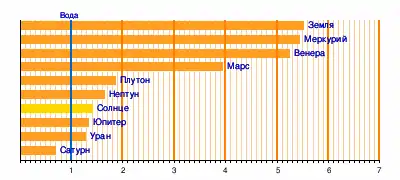 - Средние плотности небесных тел Солнечной системы см. на врезке.
