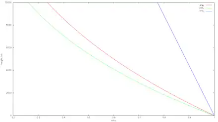 Эти три формулы (зависимость температуры, давления и плотности от высоты) и использованы для построения графиков, приведенных справа. Графики нормализованы — показывают общий вид поведения параметров. «Нулевые» значения для верных вычислений нужно каждый раз подставлять в соответствии с показаниями соответствующих приборов (термометра и барометра) на данный момент на уровне моря.