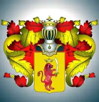 Описание герба: Выдержка из Общего гербовника На щите, имеющем золотое поле, изображена корона и под оною красный лев с мечом, стоящий на задних лапах. Щит увенчан обыкновенным дворянским шлемом с дворянскою на нем короною. Намет на щите золотой, подложенный красным |