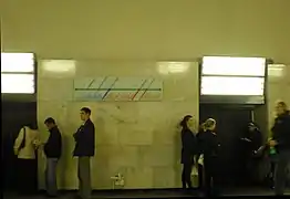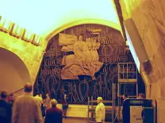 Площадка перехода, на которой находится рельефное панно «Александр Невский», освещается оригинальными светильниками, такими же, как на станции «Площадь Александра Невского-2».