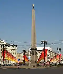 В 1985 году к сорокалетию Победы в Великой Отечественной войне по проекту архитекторов В. С. Лукьянова и А. И. Алымова в центре площади был установлен гранитный Обелиск «Городу-герою Ленинграду»[6][7][3].