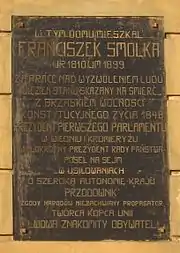 Мемориальная доска Францишеку Смолке на площади, носившей его имя в 1885—1946 годах