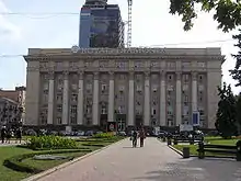 Монументальное административное здание, в котором ранее размещалось Министерство угольной промышленности УССР, было построено в 1956 году. С его строительством площадь Ленина получила современное пространственное выявление, так как к тому времени уже был заложен Первомайский сквер, который завершал пространство площади с северной стороны, и построены жилые и административные здания вдоль правой стороны улицы Постышева[2].