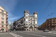 - Каменноостровский проспект, 31—33 / улица Льва Толстого, д. 1—3 — доходный дом В. М. Корзинина, 1903—1904 год, арх. П. М. Мульханов. Угловые башенки-эркеры, выходящие на площадь Льва Толстого, первоначально были увенчаны луковками (утрачены в результате пожара в 1980-х гг.).