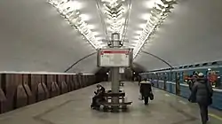 Перрон освещается при помощи люминесцентных светильников, подвешенных в три ряда к потолку оштукатуренного свода, по всей длине платформы. Светильники закрыты индивидуальными ажурными обрамлениями[11]. Путевые стены станции представляют собой ребристые короткие блоки, которые переплетаются друг с другом. Дополнительно часть из них были стянуты металлическими сварными балками[13].