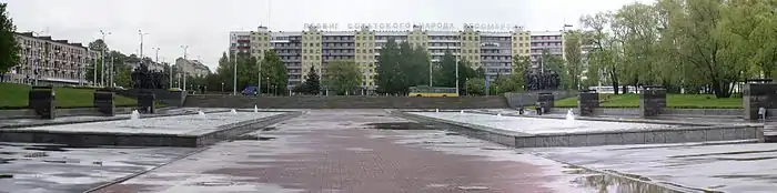 Центральное место на площади занял мемориальный комплекс в честь советских воинов-освободителей, партизан и подпольщиков Витебщины или, по-народному, «Три штыка» (архитектор Ю. Шпит, скульпторы Б. Марков, Я. Печкин). Монумент выполнен в виде трёх обелисков высотой 56 метров, на 6-метровой высоте они объединены рельефно-скульптурным поясом. Внизу горит Вечный огонь. Возле памятника — два бассейна с фонтанами. С двух сторон площади — по пять пилонов, на них нанесены годы войны. К набережной Двины ведут три большие лестницы.