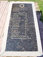 | Могила Яковенко И. М.[7] | Скульпторы: Мухин В. И., Федченко В. Х. | 1944 год (рек. 1974 год) | ![]() | На могиле памятник: на постаменте из необтесанного камня пирамидальной формы — скульптура орла. Его правое крыло распростёрто, левое — безжизненно опущено, в клюве — пулемётная лента. На лицевой стороне постамента доска с надписью: «И. М. Яковенко 1910—1942». Скульптура орла из железобетона, высота 1,4 м. Постамент из камня и цемента, высота 2,3 м. Мемориальная доска из металла. |