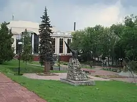 | Братская могила офицеров Советской Армии[8] | Скульптор: Мухин В. И. | 1944 год | ![]() | На прямоугольном постаменте — скульптура коленопреклонённого офицера Советской Армии, целующего боевое знамя. На лицевой стороне постамента надпись: укр. «Визволений Ворошиловград — героям Великої Вітчизняної війни». Постамент из кирпича и цемента. Скульптура — железобетон, окованный медью.