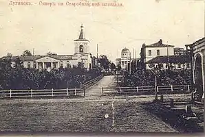 Самой первой церковью на территории посёлка Луганский завод стала деревянная Успенская церковь, возведённая в 1821 году на Базарной площади[2]. В 1830 году она сгорела, и новая каменная церковь была построена лишь в начале 1850-х годов[2].