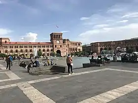 с 17 по 23 апреля 2018 года на Площади Республики прошли массовые акции протеста против избрания премьер-министром Сержа Саргсяна. 22 апреля, в день, когда был арестован оппозиционный лидер Никол Пашинян, на площадь были выведены силы полиции. Десятки протестующих были задержаны.[56][57] К вечеру около 120,000 протестующих вышли на площадь и прилегающие улицы.[58] На следующий день, 23 апреля, после отставки Сержа Саргсяна, Площадь Республики стала центром массовых празднований.[59][60] 24 апреля, в День памяти жертв геноцида армян десятки протестующих вышли на улицу, чтобы прибраться на площади и прилегающих улицах.[61] 1 и 8 мая на площади прошли митинги. 8 мая, когда его избрали премьер-министром, Пашинян выступил на площади перед своими сторонниками. 17 августа 2018 года Пашинян провел митинг, посвященный его первым 100 дням пребывания у власти. В митинге приняли участие до 150 000 человек.