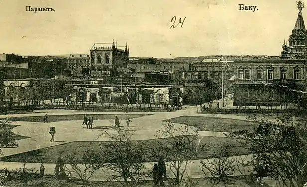 Парапет в основном застраивался Касым-беком Гаджибабабековым. Он здесь выстроил двухэтажные караван-сараи (ныне кинотеатр «Араз» и музей азербайджанской литературы им. Низами), жилые дома для себя, гостиницы «Гранд-отель» и «Метрополь»[2].