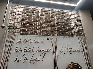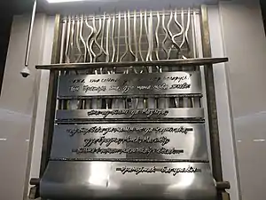 По торцам платформы на стенах установлены две скульптуры, выполненные в металле — «Ткацкий станок» работы Алексея Сорокина и Виктора Копача размером 5×6 м и «Книга белорусская» работы Максима Петруля размером 6×6 м. Обе скульптуры несут слова основоположника новой белорусской литературы Франтишка Богушевича — на первой: «Можа, хто спытае: дзе ж цяпер Беларусь? Там, братцы, яна, дзе наша мова жыве: яна ад Вільні да Мазыра, ад Віцебска за малым не да Чарнігава, дзе Гродна, Менск, Магілёў, Вільня і шмат мястэчкаў і вёсак...» (в переводе с белор. — «Может, кто спросит: где же сейчас Белоруссия? Там, братцы, она, где наш язык живёт: он от Вильно до Мозыря, от Витебска за малым до Чернигова, где Гродно, Минск, Могилёв, Вильня и много местечек и деревень...»), на второй: «Не пакідайце ж мовы нашай беларускай, каб не ўмёрлі» (в переводе с белор. — «Не утратьте же язык наш белорусский, чтобы не умерли»)[9].