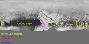 ![]() Снимок планеты в естественных цветах, сделанный автоматической межпланетной станцией (АМС) «Новые горизонты» 14 июля 2015 года с расстояния 35 445 км | ||||