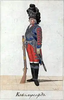 - сост. Яков фон Люде, грав. Кристиан Гейслер. Илл. 8. Кавалергард. // Изображение мундиров российско-императорскаго войска, состоящих из 88 лиц илюминованных 11 с., [1] л. фронт., 88 л. ил. — СПб.: Тип. Сухопут. кадет. корпуса, 1793.
