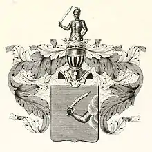 На щите дворянский коронованный шлем. Нашлемник: выходящий воин в шишаке и в латах, держащий в правой руке меч. Намёт на щите голубой, подложенный серебром.