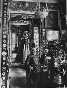 Сокровища размещены где только можно, без всякой системы: картины и портреты развешаны по стенам как попало, иконы теснятся возле больших пейзажей или маленьких силуэтов в старинных рамах, а возле стен, в витринах и на шкапах громоздятся фарфоровая посуда, самовары чуть ли не петровского времени, старинные часы, древнее оружие…