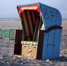 Первая пляжная корзина была создана в 1882 году[3] немецким мастером по плетению обычных корзин Вильгельмом Бартельманом[4][5]. Представляет собой плетёный стул или кабинку с навесом. Благодаря своей подкладке, она защищает от атмосферных воздействий, от ветра, солнца, дождя и песка[6][7]. В зависимости от модели, выдвижные подножки, навесы и складные столы предлагают пользователю дополнительный комфорт. Считается, что идею изобретателю подала женщина по имени Эльфриде, у которой от холодного ветра были обострения ревматизма, но она хотела продолжать принимать солнечные ванны[2]. Изобретение очень быстро стало настолько популярным, что создатель и владелец мастерской по плетению корзинок открыл несколько филиалов и стал производить не только одноместные, но и двухместные изделия[2]. В настоящее время распространена на германских побережьях Северного и Балтийского морей[1], а также в других странах[2][8][9].