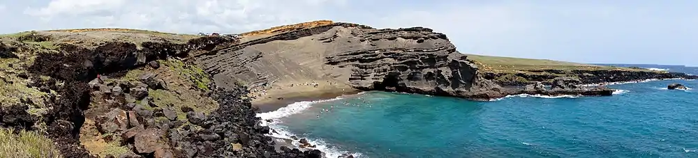 Вулканический материал (пирокластика) туфового конуса содержит оливин — силикатный минерал, содержащий железо и магний (в основном разновидность перидот). Зелёный цвет оливинового песка обусловлен наличием двухвалентного железа. Минералы группы оливина часто входят в состав базальтовой лавы выходящей из магмы[12]. Оливин иногда на гавайях называют «Гавайской Алмаз»[13]. Оливин более плотный поэтому накапливается на пляже, а менее плотный вулканический песок выносится в море[14][15].