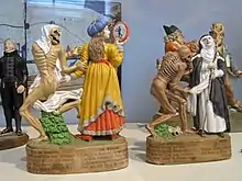 Позже в содержании подобных сочинений начинает преобладать горький юмор: смерть изображается, например, ловким шулером, наверняка обыгрывающим всякого партнера, или водителем хоровода, в котором невольно участвуют люди всех возрастов, званий и состояний, или злорадным музыкантом, заставляющим всех и каждого плясать под звуки своей дудки. Такие иносказания пользовались большой популярностью и так как по заключавшемуся в них назидательному элементу могли служить к укреплению религиозного чувства в народе, то католическая церковь ввела их в круг мистерий и допустила их изображения на стенах храмов, монастырских оград и кладбищ. Драма и танцы были в ту пору неразрывно связаны между собой; этим объясняется происхождение названия Пляски смерти. В простейшем своём виде она состояла из краткого разговора между смертью и 24 лицами, разделённого по большей части на четверостишия. Представления этого рода во Франции были в большом ходу в XIV веке. По-видимому, в них выводились на сцену семь братьев-Маккавеев, их мать и старец Елеазар (II кн. Маккав., гл. 6 и 7), вследствие чего явилось название «Маккавеевская Пляска», потом превратившееся в «Danse macabre». Быть может, впрочем, название Маккавеевской произошло от того, что представление Пляски смерти первоначально совершалось в день памяти перенесения мощей Маккавеев в 1164 году из Италии в Кёльн. Лицевые изображения Пляски смерти на стенах парижского кладбища des Innocents существовали уже в 1380 году. Картины обыкновенно сопровождались виршами, соответствовавшими содержанию представленных сцен.