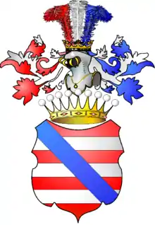 Описание герба: по Долгорукову В красном поле три серебряных полосы горизонтальных, и одна голубая полоса диагональная, идущая от правого верхнего угла к нижнему левому. На гербе графская корона, и на ней шлем с графскою же короною и с тремя страусовыми перьями: красным, белым и голубым. |