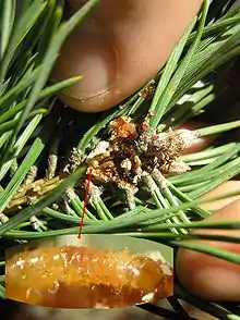 После спаривания самки откладывают яйца по одному вблизи влагалища хвоинок либо возле почек, включая верхушечную, молодых сосен. Свежеотложенные яйца — светло-желтого цвета, продольно-овальной формы, размерами 1,1×0,8 мм. Со временем становятся коричневыми. Стадия яйца длится 2—3 недели.
