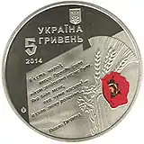 На аверсе: малый государственный герб Украины: в центре — стихи Павла Тычины «Я ЄСТЬ НАРОД, ЯКОГО ПРАВДИ СИЛА НІКИМ ЗВОЙОВАНА ЩЕ НЕ БУЛА. ЯКА БІДА МЕНЕ, ЯКА ЧУМА КОСИЛА! — А СИЛА ЗНОВУ РОЗЦВІЛА… ПАВЛО ТИЧИНА». Букет из васильков, колосьев и красных маков (красный цвет исполнен методом тампопечати). Надписи «УКРАЇНА 5 ГРИВЕНЬ 2014». Логотип Монетного двора НБУ. На реверсе: две женские фигуры на фоне карты Украины. Надписи «28 ЖОВТНЯ 1944 22 ЧЕРВНЯ 1941 ВИЗВОЛЕННЯ УКРАЇНИ ВІД ФАШИСТСЬКИХ ЗАГАРБНИКІВ». |