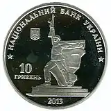 На аверсе: малый государственный герб Украины, мемориальный комплекс на Саур-Могиле, надписи «НАЦІОНАЛЬНИЙ БАНК УКРАЇНИ МЕМОРІАЛЬНИЙ КОМПЛЕКС `САВУР-МОГИЛА` 2013 10 ГРИВЕНЬ», логотип Монетного двора НБУ. На реверсе: звезда из ленты Ордена Славы, лавровая ветвь. Надписи «70 років ВИЗВОЛЕННЯ ДОНБАСУ ВІД ФАШИСТСЬКИХ ЗАГАРБНИКІВ 1943». |