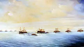 Маневры на Ревельском рейде 24 июля 1902 года. Худ. Повалишин Н. И. 1904 год. Подарена автором в 1904 году. Х., м. 83х145 № 1555. Из архива Центрального военно-морского музея, Ст.-Петербург.