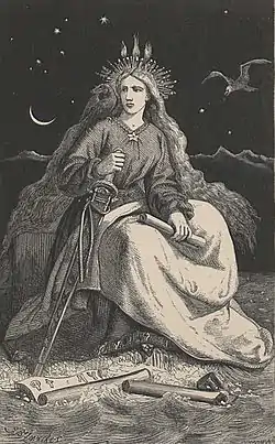 Впервые Повелительница горы была описана в поэме Ofsjónir Эггерта Олафсона (англ.), (1752), однако её имя было упомянуто в первый раз в поэме Eldgamla Ísafold Бьярна Тораренсена (англ.). Начиная с того времени она стала хорошо известным символом в исландской поэзии.