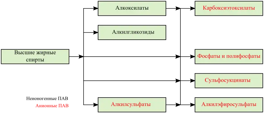 Важнейшим сырьём в производстве современных поверхностно-активных веществ для синтетических моющих средств являются высшие жирные спирты, которые в зависимости от реагента дают неионогенные или анионные ПАВ, что иллюстрирует приведённая ниже схема[2]:[стр. 5].