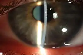 ![]() Кератит Тигесона. Чуть выпирающие серовато-белые субэпителиальные помутнения. | |
