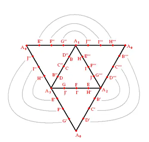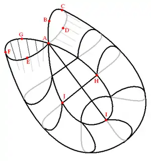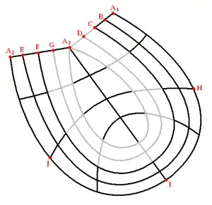 Рисунок показывает восточную секцию, ограниченную тремя петлями ABCDA, AEFGA, и AHIJA. Третья петля, AHIJA является линией узловых точек, где Восточная секция пересекает себя. Петля ABCDA является линией узловых точек, по которой Восточная секция соединена с Западной секцией, а петля AEFGA является линией узловых точек, по которой Восточная секция соединена с Южной секцией. Точка здесь на самом деле перекрывает четыре различные точки: .