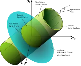 В пространстве напряжений при достижении предела текучести определяют некоторую поверхность которая носит название поверхности текучести. Если принять, что условие текучести не зависит от гидростатического напряжения всестороннего сжатия (давления), то соответствующие поверхности текучести будут иметь форму цилиндрической поверхности, с образующей, параллельной центральной оси. Точки пространства напряжений, лежат внутри цилиндрической поверхности текучести, соответствуют упругому состоянию, а точки, лежащие на этой поверхности, представляют начальное пластическое напряженное состояние. Координаты каждой точки поверхности текучести дают сочетание главных напряжений, вызывается началом пластической деформации. Пересечения этой поверхности плоскостями представляет собой кривую текучести.