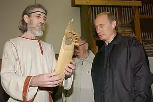 ![]() В. Поветкин показывает В. Путину реконструированные лирообразные гусли (17 июля 2004) | |