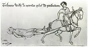Между оглашением и исполнением приговора обычно проходило несколько дней, в течение которых осуждённые содержались по месту заключения. Вероятно, в эпоху раннего Средневековья преступника волокли на казнь, просто привязав его сзади к лошади. Поздне́е утвердилась традиция, согласно которой осуждённого привязывали к запряжённым лошадью деревянным салазкам, напоминавшим створку ворот плетёной изгороди («хёрдл»; англ. hurdle)[32]. По мнению британского юриста и историка Фредерика Уильяма Мейтленда, это требовалось для того, чтобы «[предоставить] в распоряжение палача ещё живое тело»[33]. Глагол to draw, входящий в официальное именование казни, делает не вполне очевидным действительный порядок следования ритуальных процедур. Одно из определений to draw во втором издании Оксфордского словаря английского языка (1989) — «извлекать из тела внутренности или кишки; потрошить (домашнюю птицу и т. п. перед приготовлением; изменника или иного преступника — после повешения)» (англ. to draw out the viscera or intestines of; to disembowel [a fowl, etc. before cooking, a traitor or other criminal after hanging]) — сопровождается примечанием: «из обстоятельств большинства казней не ясно, подразумевается ли в их названии указанное значение или значение 4 (Волочение [преступника], привязанного к хвосту лошади, деревянным салазкам и т. п., к месту казни; принятое в старинном праве наказание за государственную измену). Судя по всему, в случаях, когда drawn [„проволочён“ или „выпотрошен“] упоминается после hanged [„повешен“], речь идёт именно о потрошении» (англ. in many cases of executions it is uncertain whether this, or sense 4 [To drag (a criminal) at a horse’s tail, or on a hurdle or the like, to the place of execution; formerly a legal punishment of high treason], is meant. The presumption is that where drawn is mentioned after hanged, the sense is as here)[34]. По мнению индийского историка Рама Шарана Шармы: «В тех случаях, когда — как в шутливой присказке „повешен, потрошён и четвертован“ (означающей человека, от которого удалось окончательно избавиться) — слово hanged или hung предшествует слову drawn, его следует понимать именно как потрошение изменника»[35]. Противоположного взгляда придерживается британский историк и писатель Иэн Мортимер. В эссе, опубликованном им на собственном сайте, утверждается, что извлечение внутренностей из тела преступника — несомненно, применявшееся во многих средневековых казнях — стало расцениваться как заслуживающее отдельного упоминания лишь в новое время, и отождествление drawing с потрошением следует считать ошибочным. По мнению Мортимера, упоминание волочения после повешения объясняется тем, что волочение было малозначительной, второстепенной составляющей традиционного ритуала[36].