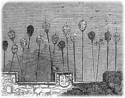 - Evelyn, 1850, p. 341: «I saw not their execution, but met their quarters, mangled, and cut, and reeking, as they were brought from the gallows in baskets on the hurdle».