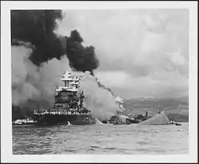 Несколько бомб с высотных бомбардировщиков упали у правого борта, но они привели лишь к незначительным повреждениям осколками дымовых труб и зенитных орудий правого борта[7]. Горящая нефть с «Аризоны» достигла «Калифорнии» и в 9:55 ее корму начали лизать языки пламени. В 10:02 был отдан приказ покинуть корабль. Котлы и машины были остановлены. Ветер отнес огонь, и в 10:15 поступил приказ вернуться на корабль. Но после этого энергию на корабле уже не восстановили и пожаротушением и откачкой воды занимались с помощью переносных средств и подошедших тральщиков. К тому же крен достиг 8,5° и для его выравнивания затопили котельные отделения 5 и 7 правого борта[5].