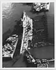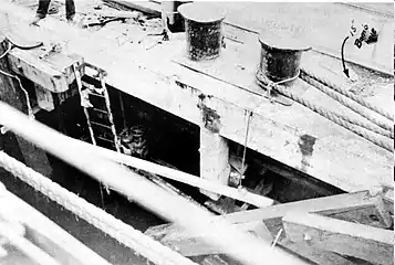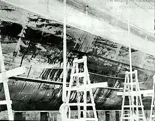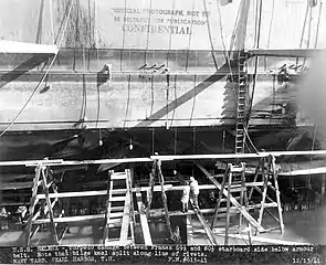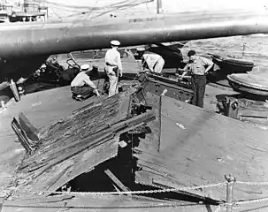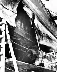 Три бомбовых пробоины были заделаны с помощью деревянных пластырей[24]. Приток воды уменьшался заделыванием пробоин с помощью резиновых накладок и волокна хлопкового дерева, крепившихся с помощью распорок. В одном случае водолазам пришлось сварить стальную заплату в месте особо крупной пробоины. В месте торпедного попадания решили установить большой коффердам[25].